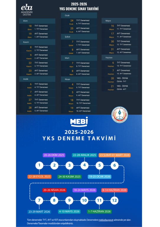 Milli Eğitim Bakanlığınca geliştirilen MEBİ uygulaması ve EBA Akademik Destek platformlarında 2025-2026 Eğitim Öğretim yılında yapılacak Türkiye Geneli Deneme Sınavı Tarihleri yayınlandı. Öğrencilerimiz belirtilen tarihlerde online olarak deneme sınavlarına katılabilir.